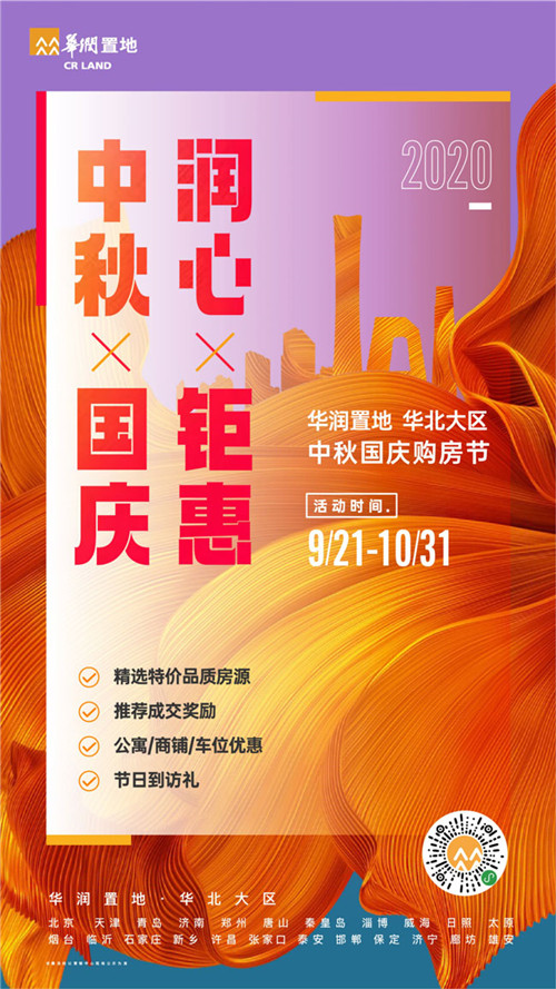 房訊網訊 在國慶、中秋雙節來臨之際,華潤置地推出整合營銷活動,華北大區22城市40盤,以“精選特價品質房源,推薦成交獎勵,公寓、商鋪、車位優惠,節日到訪禮”。四重禮遇,歡度雙節,給家一個更優惠的方案。