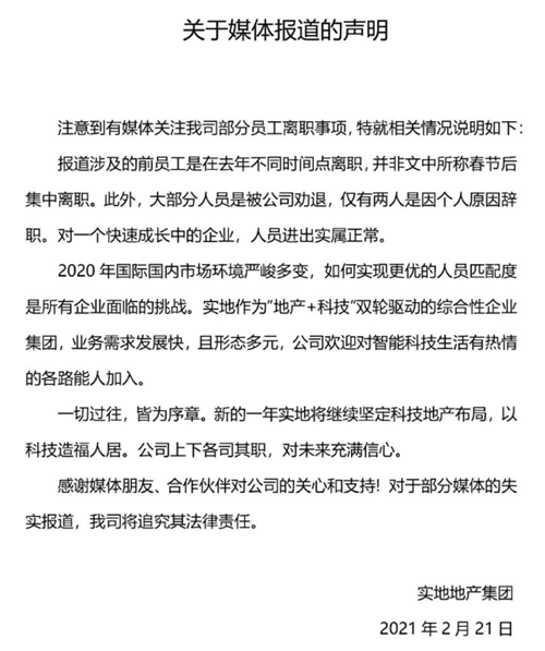 今日,實地集團通過其官方微信公眾號發(fā)布聲明稱,報道涉及的前員工是在去年不同時間點離職,并非文中所稱春節(jié)后集中離職。此外,大部分人員是被公司勸退,僅有兩人是因個人原因辭職。對一個快速成長中的企業(yè),人員進出實屬正常。