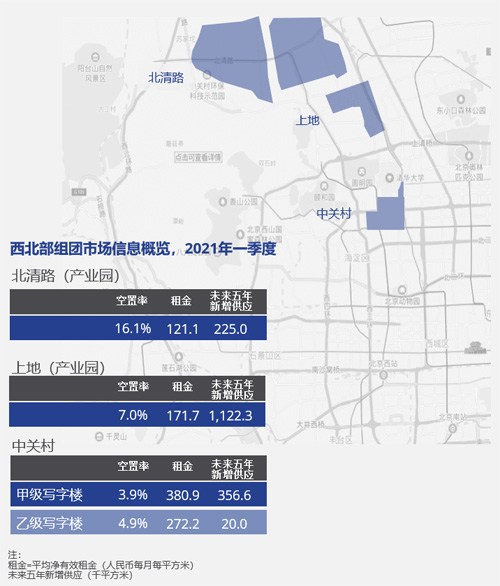 受益于互聯網科技企業的快速擴張和發展,中關村子市場空置率長期保持在5%以下,租金水平僅次于金融街。截止到2021年一季度,中關村甲級寫字樓市場的租金保持在381元每月每平米,空置率降至只有3.9%,整個市場處于基本飽和的狀態,核心區域的優質寫字樓資源極度稀缺,不過未來3-4年,中關村將迎來約40萬新項目,這會在很大程度上緩解該區域“一房難求”的現狀。