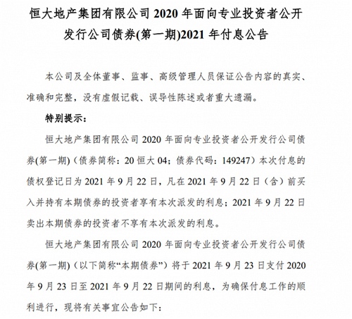 9月22日,恒大地產(chǎn)集團有限公司發(fā)布2020年面向?qū)I(yè)投資者公開發(fā)行公司債券(第一期)2021年付息公告,40億元20恒大04債券將于2021年9月23日支付2020年9月23日至2021年9月22日期間的利息。