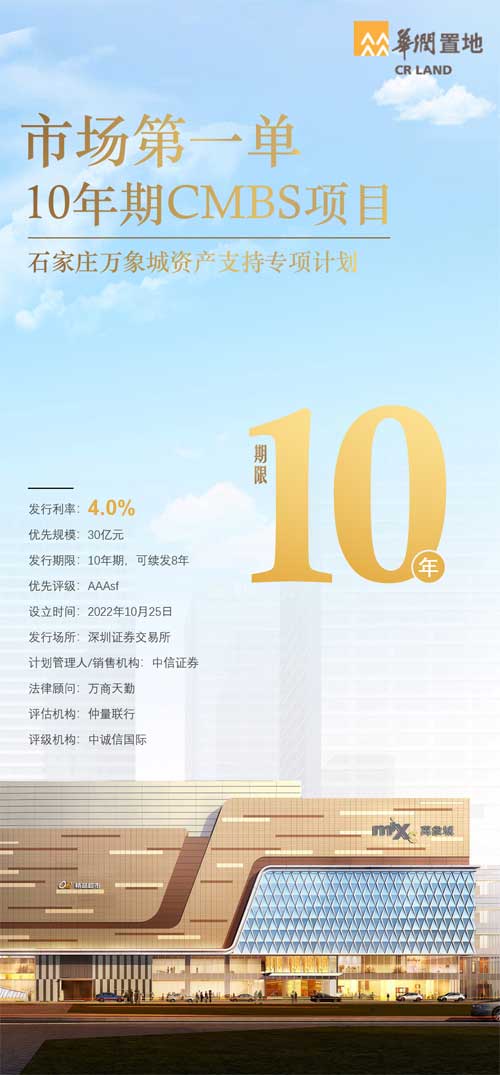10月25日,華潤置地成功發行10年期“石家莊萬象城資產支持專項計劃(CMBS)”,發行規模30.01億元,發行利率4.0%,為市場第一單10年期CMBS,相對同業每3年重定價拆期CMBS優勢明顯。