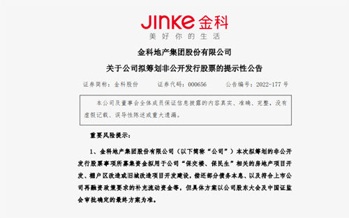 金科股份在12月5日晚間也發布公告稱,擬向不超過35名特定投資者非公開發行股票,募集資金擬用于公司“保交樓、保民生”相關的房地產項目開發、棚戶區改造或舊城改造項目開發建設,償還部分債務本息、以及符合上市公司再融資政策要求的補充流動資金等。