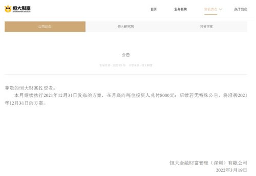 房訊網訊 3月19日,恒大財富官網公告,本月繼續執行2021年12月31日發布的方案,在月底向每位投資人兌付8000元;后續若無特殊公告,將沿襲2021年12月31日的方案。