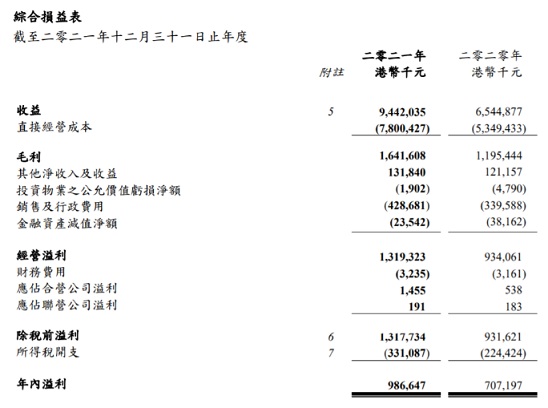 2021年,中海物業(yè)收益94.42億港元,同比增44.3%;毛利16.42億港元,同比增37.3%;毛利率輕微下滑至17.4%,2020年為18.3%;公司股東應(yīng)佔(zhàn)溢利較去年上升40.5%,達(dá)9.84億港元。每股基本及攤薄后盈利為港幣29.93仙,增長40.5%。