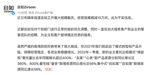 6月10日,針對(duì)自如正開展大規(guī)模裁員,裁員比例約20%,經(jīng)營規(guī)模縮減15萬間的消息,自如方面回應(yīng)稱“此為不實(shí)信息”。