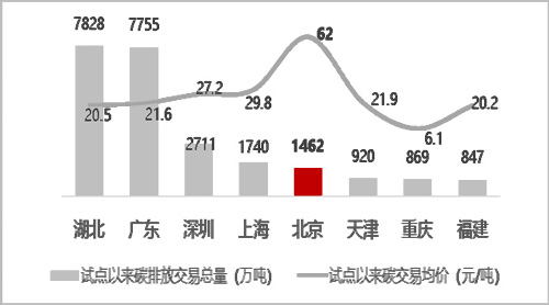 十年前,中國在北京、天津、上海、重慶、湖北、廣東及深圳開展了碳排放權交易試點工作,2016年新增福建碳交易試點;試點期間我國共交易碳排放權限2.41億噸,其中湖北和廣州交易量最大;從交易均價來看,北京碳交易均價遠超其他省市交易均價。2021年7月16日全國碳市場正式開市,截至2021年12月31日,全國碳市場第一個履約周期累計運行114個交易日,碳排放配額累計成交量1.79億噸,累計成交額76.61億元。