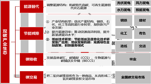 能源替代、節能減排、碳吸收、碳交易代表了雙碳經濟發展的四大核心板塊。其中,能源替代是長期持續的過程,伴隨新能源技術的研發投入和市場化推廣;節能減排短期可以創造明顯成效,是碳中和目標實現有力的保障。在下游工業生產和交通運輸服務等領域,必然需要推廣低碳技術應用和低碳發展機制創新,從而影響行業各類發展要素的流動。碳吸收從平衡的角度,為減排下限提供了進一步探底的手段,結合碳交易市場化運作,推動資本流入,促進碳匯發展,加快生態環境建設。