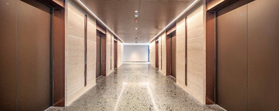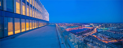 通州C01大廈總體量約6萬平方米,其中辦公總面積約57415.48平方米和2843.74平方米地上商業面積,是170米總高的超高層建筑。其地上部分36層,地下部分為4層。高低區梯廳各分設6部進口日立高速電梯,一共12部,另有2部貨梯和2部1層向車庫的轉換梯,構成整個項目的垂直交通系統。比較獨特的是,由于我們的裙樓1-5層為富力商業,所以本項目的辦公樓層是自9層起, 6、7層為項目預留的本區域僅有的地上具備餐飲條件的員工食堂區作為入住企業的辦公配套。