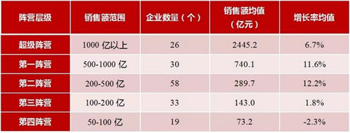 2020年1-10月,房企不同陣營的發展分化。1000億以上超級陣營共26家,銷售額增長率均值為6.7%。第一陣營(500-1000億)共有30家,銷售額增長率均值為11.6%。第二陣營(200-500億)有58家企業,銷售額增長率均值為12.2%;第三陣營(100-200億)共33家,銷售額均值為143億元,第四陣營共19家,銷售額均值為73.2億。