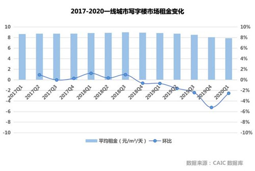 分析認為,自2018年四季度起,在經濟增速下降和貿易爭端影響下,一線城市整體寫字樓市場一直處于下行態勢,平均出租率和租金均出現連續6個季度下跌,新冠疫情的爆發則進一步加重了這一下跌態勢。