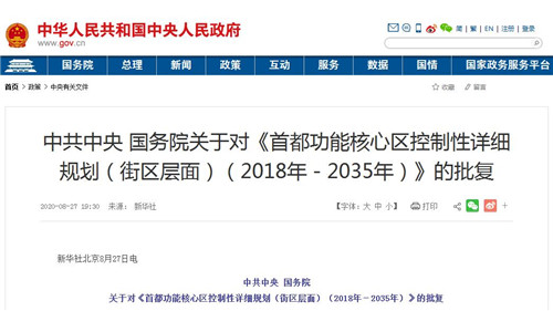 房訊網訊 中共中央、國務院日前批復同意《首都功能核心區控制性詳細規劃(街區層面)(2018年—2035年)》。