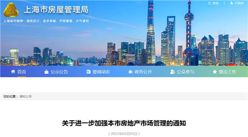 房訊網訊 3月3日,上海市住房和城鄉建設管理委員會、上海市規劃和自然資源局、上海市房屋管理局聯合發布《關于進一步加強本市房地產市場管理的通知》。