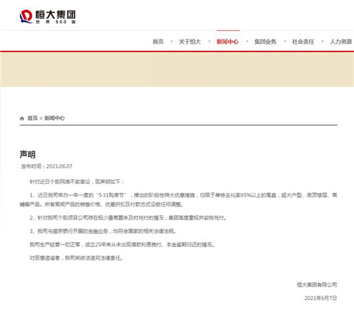 恒大重點對近日網上幾大熱點問題進行回應,一是近日公司舉辦一年一度的“5·31購房節”,推出的階段性特大優惠措施,僅限于單棟去化率95%以上的尾盤,超大戶型、底頂樓層、商鋪等產品。所有常規產品的銷售價格、優惠折扣及付款方式沒做任何調整。二是針對公司個別項目公司存在極少量商票未及時兌付的情況,集團高度重視并安排兌付。三是公司與盛京銀行開展的金融業務,均符合國家的相關法律法規。
