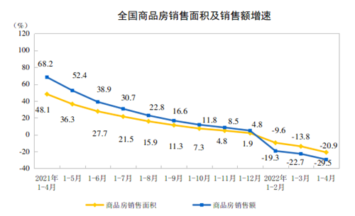銷售方面,前4個月,全國商品房銷售面積39768萬平方米,同比下降20.9%;其中,住宅銷售面積下降25.4%。商品房銷售額37789億元,下降29.5%;其中,住宅銷售額下降32.2%。