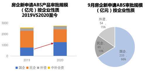 今年至今,國資房企新申請ABS產(chǎn)品總規(guī)模達1265億,同比大漲123%,已是去年全年申請總規(guī)模1.6倍。國企已逐漸超過民企成為房企資產(chǎn)證券化融資主力。“三條紅線“出臺后的九月,截至9月29日,國資房企9月新申請ABS項目總規(guī)模超200億,占比超6成。