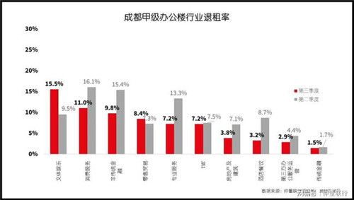 疫情沖擊各行各業,除與風險存在對沖關系的醫藥、科技互聯網等行業外,諸多企業生存壓力增大,優勝劣汰加劇。自3月起,全行業退租現象頻繁,上半年非傳統金融業退租率更是高達24.4%。進入三季度后,成都市場退租現象開始放緩,總退租面積較二季度下降28.5%。而消費服務、文體娛樂、非傳統金融仍為主要退租行業,退租率分別為15.5%、11.0%和9.8%。疫情加速行業內調整,兼并購以及破產重組事件多發,引致專業服務企業業務開始上揚,其中律師事務所更是從中獲益,季度內錄得其新租面積超1萬平方米。