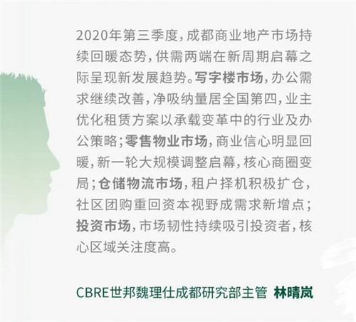 隨著成渝經濟圈建設帶來的新一輪戰略機遇,城市擴容、產業鏈升級、人才導入等逐步推進,成都商業地產的中長期價值將被更多投資者看好。預計人民幣基金機構以及自用為目的的投資者將持續活躍,核心區域現金流穩定的寫字樓是投資者最為追捧的投資標的。此外,如倉儲物流、學校教育地產等也備受關注。