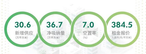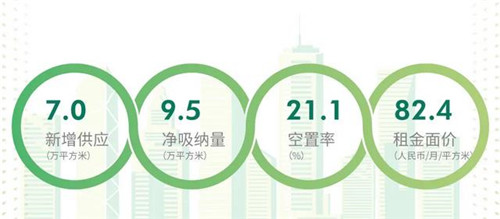 第三季度,市場錄得成華萬科大廈的交付。需求延續回暖態勢,凈吸納量居全國第四,錄得約9.5萬平方米,環比上漲32.9%,為去年同期的七成;甲級寫字樓凈吸納量約4萬平方米,環比上漲210.2%,為去年同期的六成。一方面大中型企業的租賃需求明顯升溫;另一方面部分企業抓住租金調整窗口期升級、擴租,分別占比季內辦公策略的24.3%、18.0%。相應地,市場整體空置率環比下降0.5個百分點至21.1%;平均賬面租金環比下跌0.4%至每月每平方米82.4元,跌幅收窄0.7個百分點。