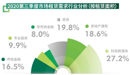 房地產建筑緊追其后,占比18.6%,市場持續錄得房企、地產交易服務及建筑設計類企業的租賃成交案例。但隨著融資環境不斷收緊,擴張需求或將放緩。傳統金融業的活躍度繼續攀升,占比較二季度上升8.1個百分點至16.5%,市場持續錄得銀行及保險頭部企業的新租、擴租及升級案例,預計下季度仍有大面積成交落地。二級租賃市場方面,盡管聯合辦公及包租公司憑借產品的便捷性、差異性積極承接小面積租賃需求實現較高入駐率,但另一方面市場隱形風險上升,部分二房東因資金流動性枯竭而存違約風險。