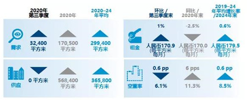 有479,400平方米的甲級寫字樓新增面積計劃在2020年第四季度入市,占到全年新增供應面積的84%。我們預期,大量的新增供應將為全市的平均租金帶來壓力,但部分新增項目可能延期。如果這些新增寫字樓項目都能如期交付,全市空置率將會升至11.3%。
