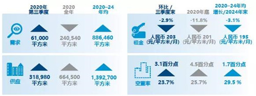 我們預(yù)期,快速發(fā)展的金融行業(yè)將促使高品質(zhì)甲級(jí)辦公需求更加旺盛,同時(shí),來(lái)自于相關(guān)專業(yè)服務(wù)業(yè)的需求也緊隨其后。業(yè)主可以更加緊密的關(guān)注以上行業(yè)的發(fā)展動(dòng)態(tài)。通過(guò)上半年和Q3全市新增需求的積極表現(xiàn),我們預(yù)計(jì)租金下跌趨勢(shì)將在未來(lái)得到一定緩解。
