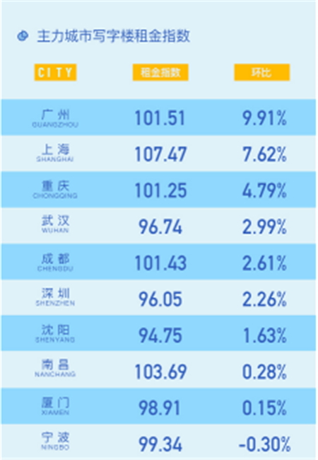 據58同城、安居客《2020年Q3三十城寫字樓租賃指數報告》顯示,三季度商業地產下行壓力仍然存在,租金指數為94.04,季度環比下跌1.69%,雖然整體寫字樓租金仍呈下行趨勢,但跌幅收窄。廣州、上海、重慶等9城市的寫宇樓租金指數上揚,其中廣州寫字樓掛牌租金環比上漲9.91%,一線城市帶頭復蘇。上海、南昌等六個城市租金指數已超去年四季度,市場正在逐步脫離疫情影響。