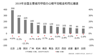 2018年,重慶辦公樓市場迎來第三方辦公新增供應,近19萬平方米新增供應投入二級租賃市場。次年集中供應引致競爭加劇,二級租賃市場步入存量時代,部分品牌承壓退出重慶市場,市場呈現兩極分化。仲量聯(lián)行數據顯示,2019年第四季度重慶二級租賃市場整體轉租率達到86.8%,環(huán)比回落2.9個百分點。但市場仍錄得部分運營商持續(xù)在渝擴張,第四季度德事商務中心進駐大都會商廈,凱德置地在來福士辦公樓A座推出自營聯(lián)合辦公品牌奕橋。二級租賃市場點燃的“價格戰(zhàn)”傳導至一級市場,迫使全市大多數業(yè)主降租以避免租戶流失。統(tǒng)計層面,2019年,重慶甲級辦公樓租金同口徑同比下跌3.3%,報86.1元/平方米/月,以價換量乃大勢所趨。