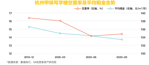 58同城、安居客《杭州寫字樓市場報告》數據顯示,截至2020年三季度,杭州甲級寫字樓存量約322.5萬平方米,領跑新一線城市。全市空置率為14.4%,低于北上深及其他新一線城市,寫字樓市場整體情況較為健康,仍有可觀的發展潛力。
