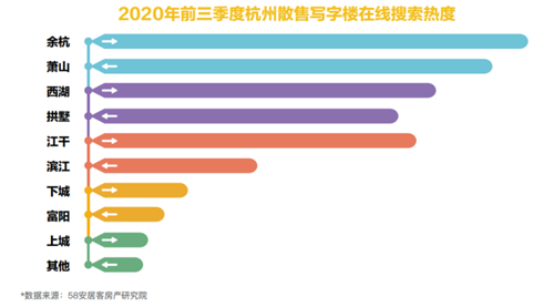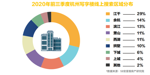 58安居客房產研究院數據顯示,區域上來看,今年前三季度杭州寫字樓線上搜索熱度最高的仍然是江干區,占整個杭州寫字樓搜索總量的29.2%,與去年同期相比,占比提高3.7%。其次是余杭區,占比為14.4%,提高了1.3%。第三、第四分別是濱江區和蕭山區。部分新興商務區如錢江新城所在的江干區、互聯網企業聚集的余杭區,搜索占比提升迅速,逐漸擠壓其他區域的市場份額。