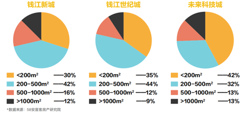 在搜索面積段分布方面,錢江新城和錢江世紀城最受青睞的是200-500m2的辦公空間,分別占比為41.5%和43.7%,但500㎡以上的面積段錢江新城的需求量是幾個“城”中最大。