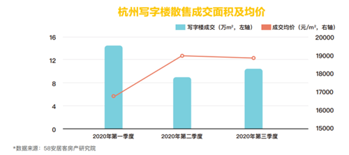 58安居客房產研究院統計顯示,杭州市2020年前三季度寫字樓散售總計成交約34萬㎡,成交均價約為1.8萬元/㎡,略低于往年,但這主要是受到集中網簽導致,實際市場價格與2019年相比保持穩定。一季度市場供應主要集中在余杭區;二季度供應多在西湖區,主要有海悅中心、柏學薈商業中心等項目;三季度在蕭山區,主要是新世界翡麗中心項目。