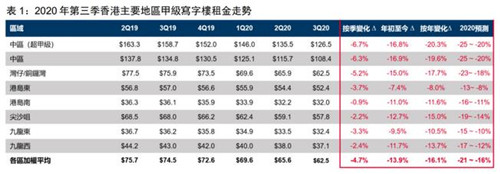 在空置率壓力下,租金也連續第六個季度下跌,沒有區域例外,中區及灣仔/銅鑼灣區跌幅最大,環比分別下跌6.3%及5.2%,同比分別下跌16.9%及15.0%,預計全年跌幅可分別達25%及23%。
