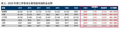 各區零售物業市場空置率三季度因此仍升至兩位數,其中銅鑼灣區空置率上升幅度最大,環比從7.9%飆升至13.2%,租金也與中環一起,環比分別下跌7.9%及7.8%,同比分別下跌41.3%及40.8%,位居所有區域跌幅的前兩位。
