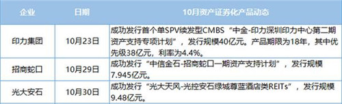 10月,據觀點指數不完全統計,商業地產資產證券化產品共發行3單,發行總額為54.43億元,較上月的9單127.63億元明顯大幅下降。其中最大額為印力發行的首個單SPV續發型CMBS,發行規模40億元,產品期限為18年,其中優先級38億元,利率為4.4%,標的物業為深圳印力中心。