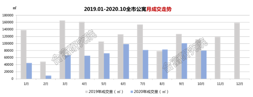 公寓市場方面,合富大數據錄得10月公寓成交量為79882㎡,同比去年“銀十”下降29%,環比9月下降21%;下半年各月成交量大致持平,基本在8-10萬㎡左右;“金九銀十”成交大體尚可,但并無表現突出的新盤,同比去年同期仍有差距。10月新增供應約4.5萬㎡,來自增城新塘的奧園康威廣場及海珠南洲板塊的中海觀瀾府。