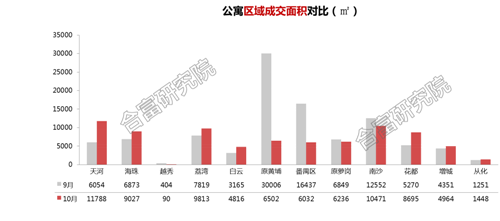 成交分布方面,雖然整體成交量環比下降,但實際上對比9月,大多數區域呈現上升的趨勢,僅原黃埔、番禺環比下降幅度較大。10月銷售榜單項目全部來自品牌開發商,越秀、碧桂園、合景均有2個以上項目進入榜單。位于市區的項目較往期多,不乏價格超6萬元的江景大平層產品,在渠道帶動下成交較好。