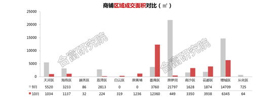 合富大數據顯示,廣州商鋪市場10月成交量為30448㎡,同比下降74%,環比9月下降46%;成交量為中等水平,近數月波動幅度較大主要受大手交易影響。而10月商鋪新增供應僅2000余方,主要來自廣鋼板塊的中海學仕里及花都恒大悅府的住宅裙商。