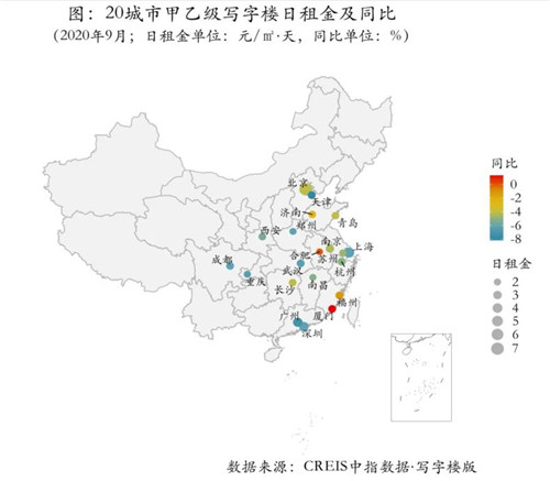盡管受疫情基本得到控制、經濟逐步復蘇、企業復工復產多重利好因素影響,三季度寫字樓市場的下行趨勢并未完全扭轉,但是多城市租金降幅有所收窄。從租金報價來看,20城市寫字樓租金仍處于下行通道但整體企穩,平均租金為2.76元/㎡·天,租金小幅下跌且跌幅明顯收窄并趨于穩定,空置率受新增供應影響小幅上升。
