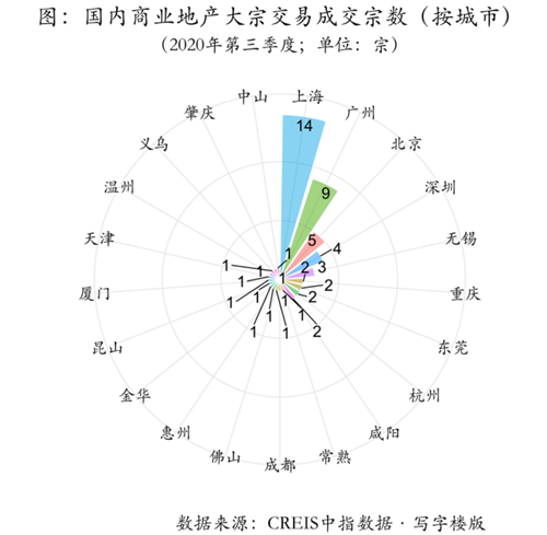 三季度,國內商辦投資市場逐漸復蘇,寫字樓、零售物業、倉儲物流等多個商業地產板塊均出現不同程度的需求回暖。本季度內國內共錄得55宗商業類大宗交易,總成交額達到483.93億元,成交面積173.47萬㎡。