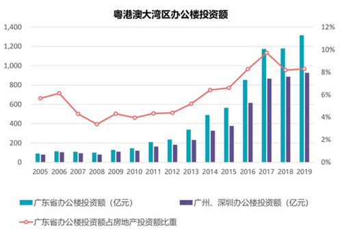 總體來看,廣東省辦公樓投資額占全省房地產投資額的比重整體呈上升趨勢。在仲量聯行最新發布的2019年全球《優質辦公樓租金追蹤指數報告》中,粵港澳大灣區中的“香港中環”蟬聯全球最貴寫字樓市場,深圳和廣州也有辦公樓上榜,分別排名22和52,全球競爭力仍有較大上升空間。
