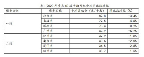 據貝殼研究院數據,2020年全國重點40城平均月租金為37.8元/平米,同比下降9.9%。一、二線城市同比降幅均達4.0%,三線城市同比下降1.5%。上半年的疫情對大部分企業以及各類商戶產生了沖擊,致使原先應返城的流動人口減少,而一、二線城市的租賃需求中外來流動人口占比更高,住房租金下降幅度較大。