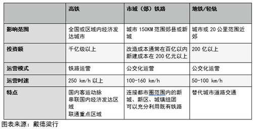 市域鐵路作為介于高鐵與地鐵之間,適宜輻射范圍在都市圈100公里范圍內的軌道交通形式,在充分利用既有鐵路設施帶來的相對低成本前提下,形成了在造價、運營時速與輻射范圍間的平衡優勢。