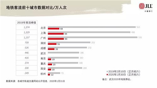 新冠疫情帶給中國消費市場的負面影響已十分顯著,減少外出等疫情管控措施導致“春節黃金周”消費大幅降低。城市交通客流是零售消費的強關聯性指標,中國主要城市地鐵客流數據的變化直接折射出消費市場受到的沖擊。2020年春節期間,中國主要城市地鐵客流相比去年同期回落80%-90%。