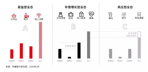 補償增長型業態:該類型業態在疫情中將受到顯著影響,但在疫情得到全面控制后,受到抑制的消費力將集中釋放,短期消費市場或出現補償式增長,但全年增速將大概率低于疫情爆發前的市場預期。代表性業態:時尚零售、旅游、線下教育、健康等。