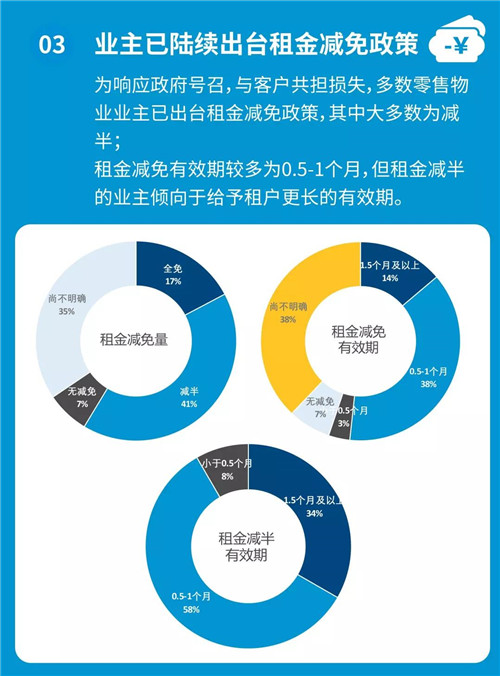 2、為共同應對疫情,約六成零售物業業主已發布了租金減免政策,其中多數有效期為0.5-1個月。