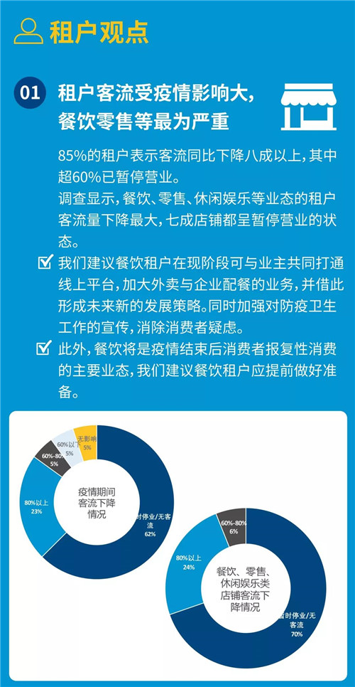 5、餐飲企業租戶在本次疫情中受創嚴重,尤其大型連鎖餐飲。我們建議餐飲租戶在當下可與業主共同打通線上平臺,加大外賣與企業配餐的業務,并借此形成未來新的發展策略。同時加強對防疫衛生工作的宣傳,消除消費者疑慮。此外,餐飲將是疫情結束后消費者報復性消費的主要業態,我們建議餐飲租戶應提前做好準備。