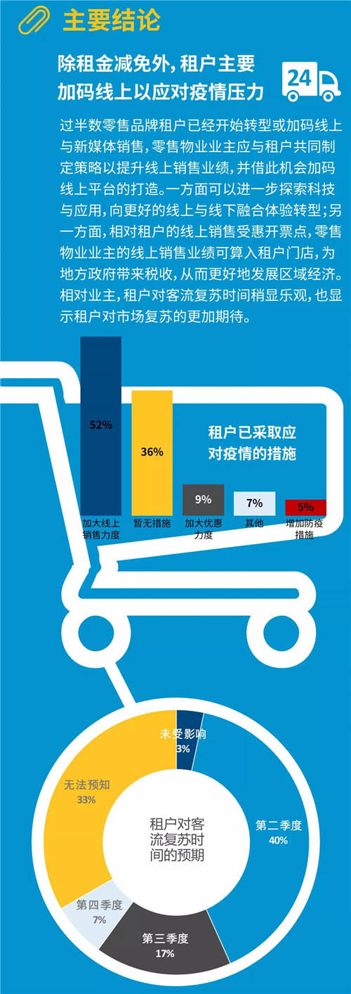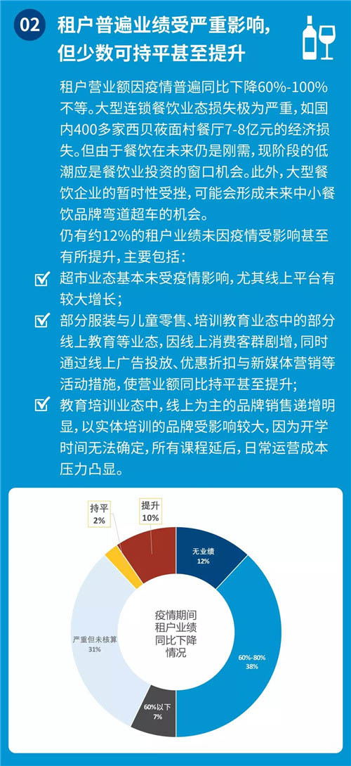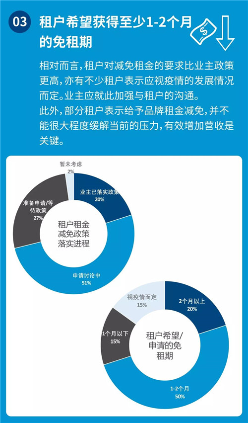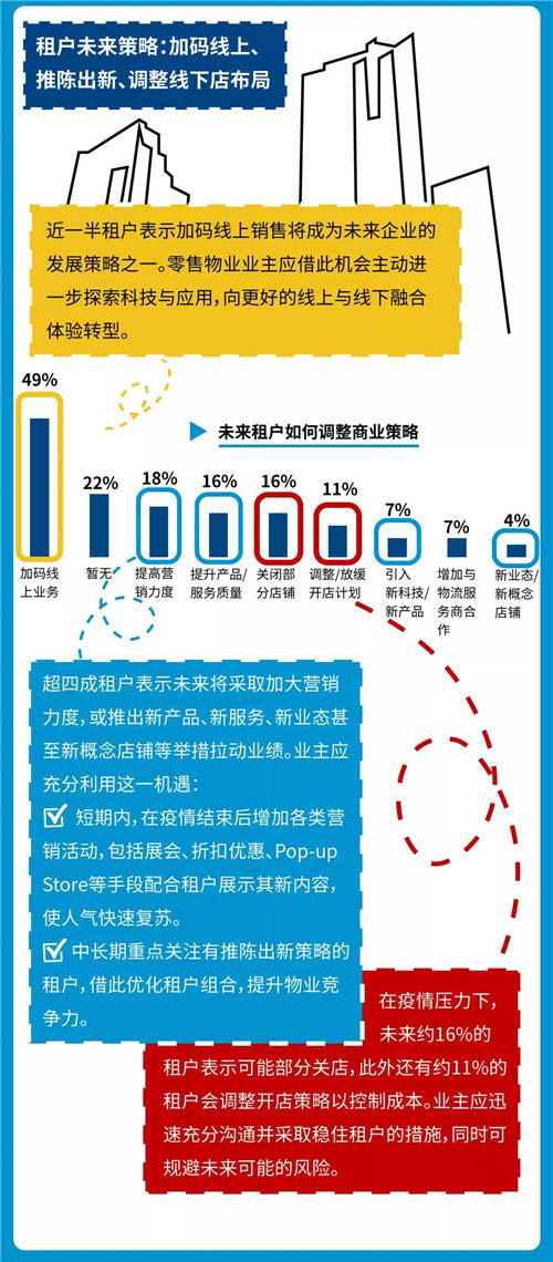 1、在疫情壓力下,未來約16%的租戶表示可能部分關店,此外還有約11%的租戶會調整開店策略以控制成本。業主應迅速充分溝通并采取穩住租戶的措施,同時可規避未來可能的風險。