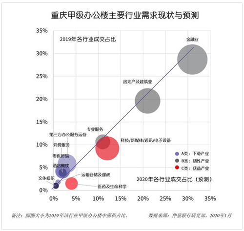 金融業、專業服務、房地產建筑三大傳統辦公樓需求的支柱產業受影響程度低于下滑產業,其產業發展基本面決定其辦公需求更具韌性。韌性產業作為經濟發展的支柱產業,對國民經濟發展以及辦公樓市場需求發揮著決定作用。短期內,金融業的對私業務會受疫情影響出現業務下滑的風險,而律所、會計師事務所等專業服務企業則會受整體經濟活動影響,但兩大產業的基本面決定其產業發展韌性十足,仍是辦公樓市場需求的核心支撐。