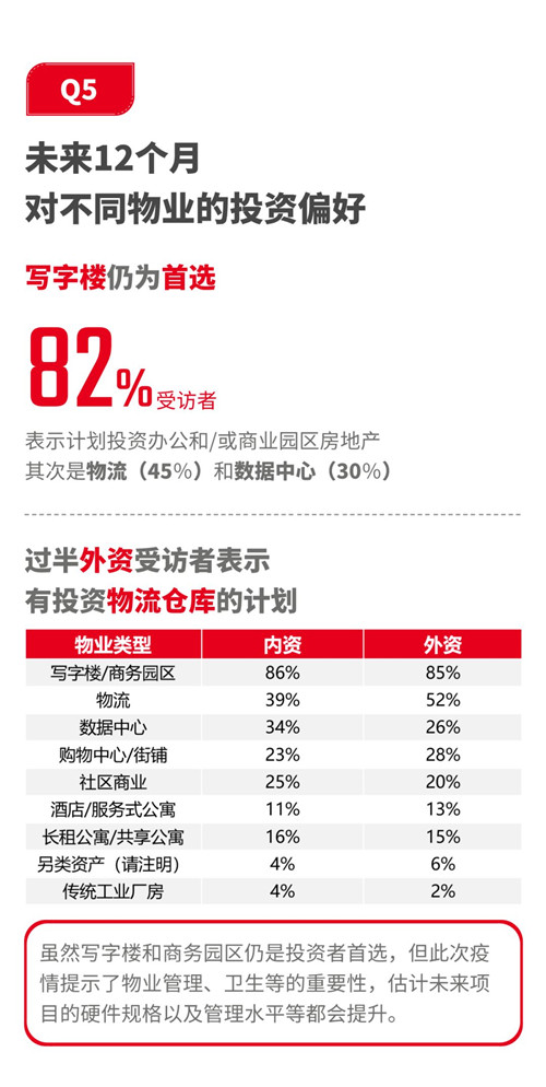 從調研結果來看,市場信心還是比較充足。超60%的受訪者認為投資活動將在疫情結束后6個月內得到反彈。并有99%的受訪者表示疫情過后依然會投資國內。城市方面,投資者對一線城市熱情更為高昂,其中尤以外資為甚,100%外資受訪者均表示未來12個月內有投資上海的計劃。