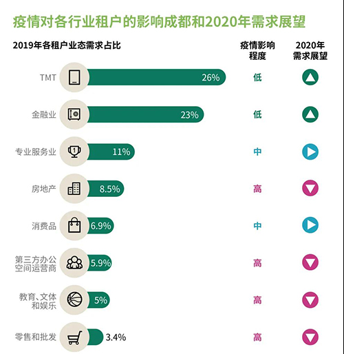 2019年,TMT、金融業和專業服務業累計占中國寫字樓租賃總量的60%,我們預計2020年這一占比將進一步提升。